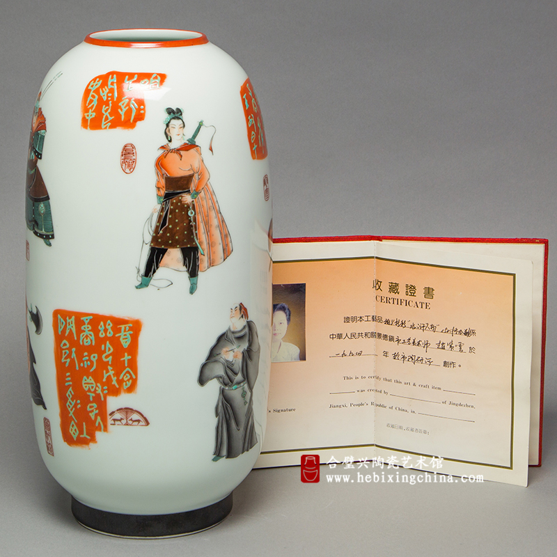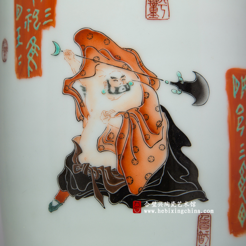 赵紫云老师以娴熟的绘画技巧把人物刻画的个性鲜明,她还充分利用了釉上彩色彩艳丽富于变化的特点把人物细节描绘的细致传神,从不同的角度立体的塑造出梁山好汉颇具个性的形象,也充分展示出陶瓷绘画的独特美感。