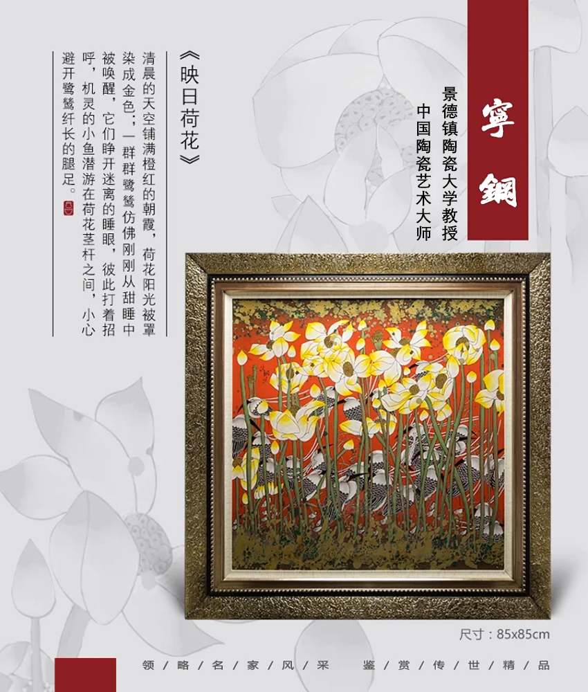宁钢教授非常巧妙的用红色的背景和黄色的荷花营造出了金色阳光洒满荷塘的光影感觉,成群的鹭鸶,欢快的鱼群为画面增添了蓬勃的生气,而底部的窑变效果则是为画面增添了丰富的质感和层次感。整幅作品把静谧与奔放两种气质融合在一起,让人仿佛也置身于金色的阳光中感受到满满的暖意。