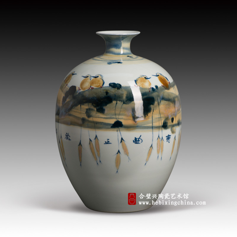 一对毛色斑斓的鸳鸯在芦苇从中交颈而卧,粉彩和半刀泥的结合把鸳鸯的形象塑造的异常鲜活可爱。高温色釉的窑变效果表现笼罩苇塘的轻雾和苇下的秋水极为传神。仿佛薄如轻纱的雾霭在四周弥漫,芦苇和草叶正随着微风轻轻的摇曳。多种装饰手法的叠加赋予了作品极强的层次感,站在作品前如同置身月下的苇塘边,透过芦苇斑驳的光影感受到鸳鸯交颈的温存。
