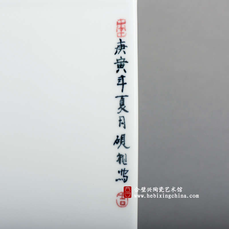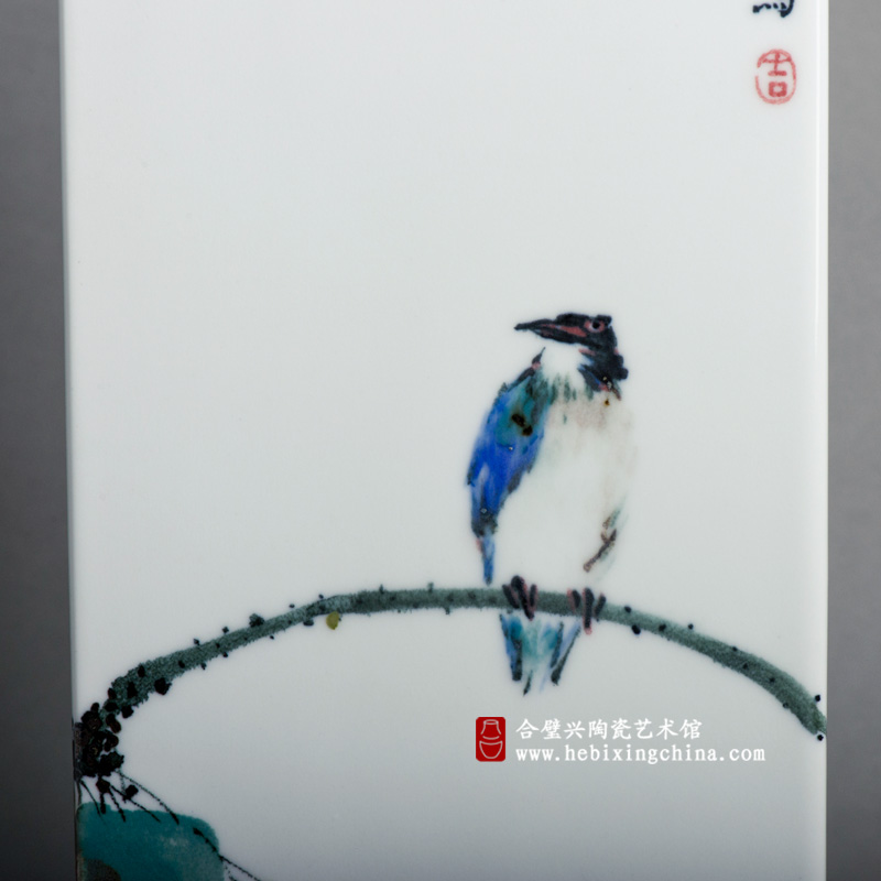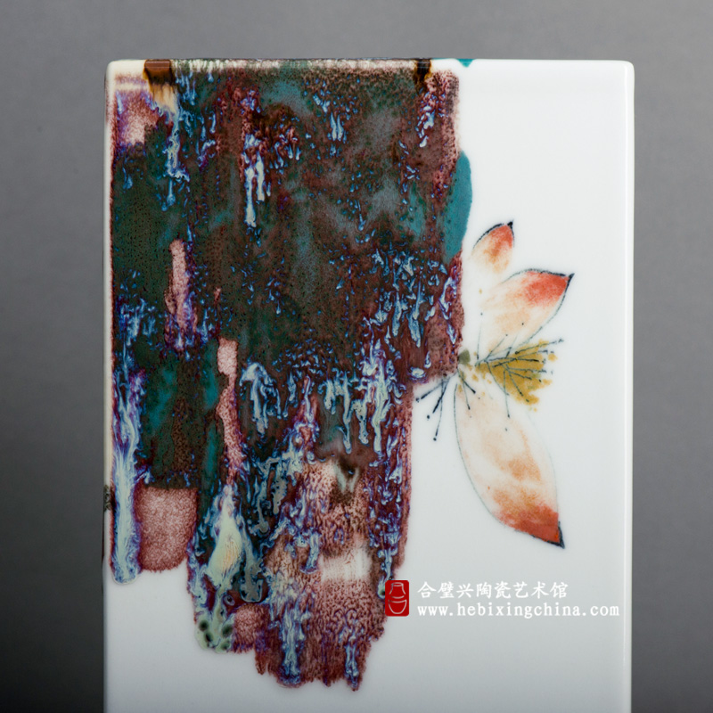 纯白胎体上的高温窑变被巧妙设计成肥硕荷叶,作品充分利用了镶器的特点,采用了过枝的手法,将窑变釉巧妙的布局于每个面上,精巧的构图让作品散发出无穷的妙趣。