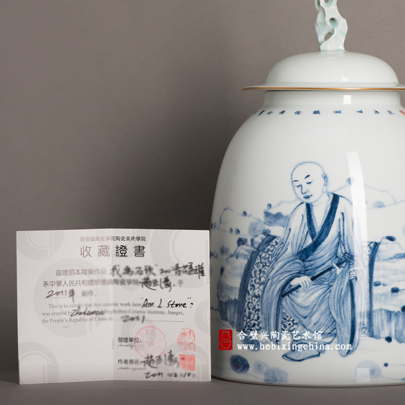 作品让不染六尘的僧人与石为伴,自然营造出空明中蕴含哲思的意境,青花的运用更是加强了作品舒朗冲淡的气场。年轻僧人手持拂尘安坐石上,透过微垂的双目,我们似乎能窥见些许他内心中“我”与“石”的思考。