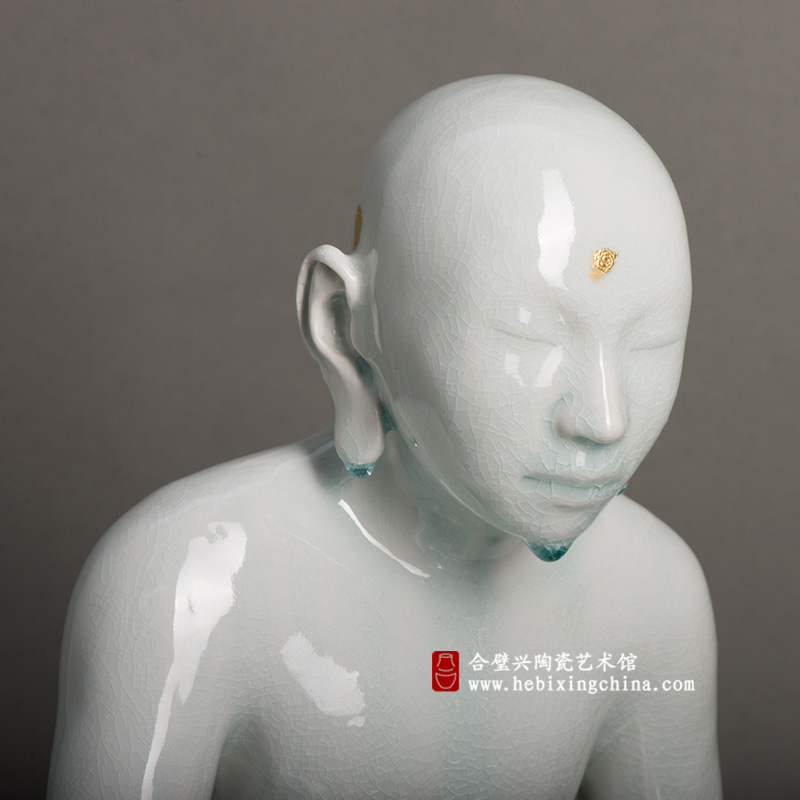 静坐于石上的僧人双目微闭,姿态安然已经进入了一种超越肉体的空明境界,清透的影青釉在僧人的指间,耳际,颌下有水滴状积釉,宛若晨间晶莹的露珠,让人感受到那种来自自然的空灵静美。