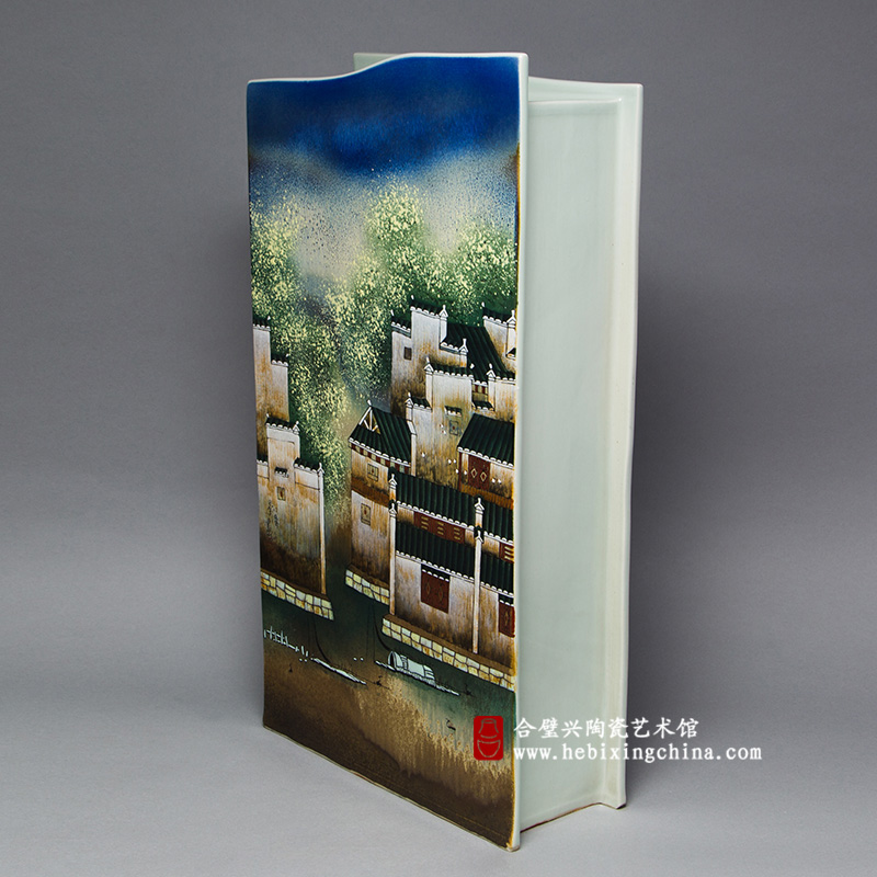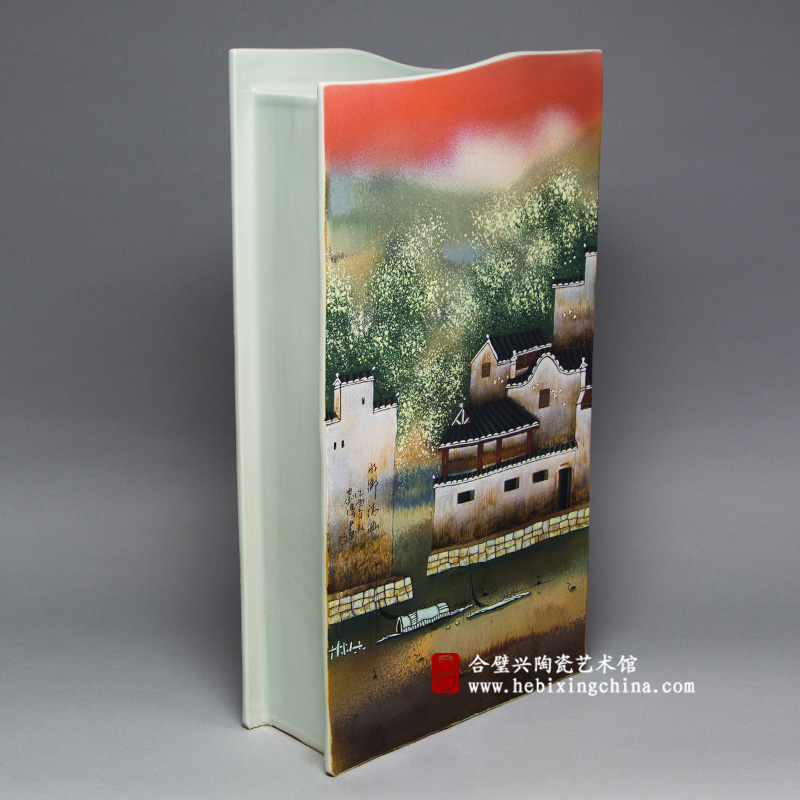 釉料经过高温烧制所产生的窑变纹理将水中的倒影和天上的霞光都描绘的惟妙惟肖,悦目的蓝色带着清晨微凉的空气催开了满树的繁花,温柔的橘红便是落日为天空染上的绚丽霞光,给青瓦白墙的水乡村庄带来暖暖的乡情。