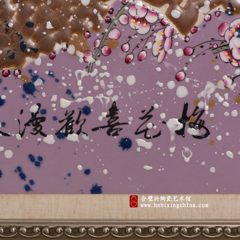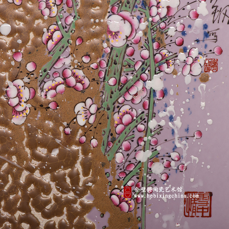 此件作品的灵感来自于浙江余杭唐梅。宁钢教授巧妙的利用了颜色釉在高温窑火中形成的缩釉,准确的用缩釉所产生的特殊的肌理效果表现出千年梅树枝干虬结,挺拔向上的不屈气节。