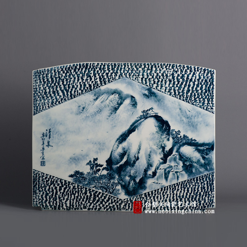 前后两面均用跳刀手法塑造出如山石的粗粝质感,跳刀地上再施青花釉,清白分明呈现出非常特殊的装饰效果,中间六边形开光中各绘一幅山水图。