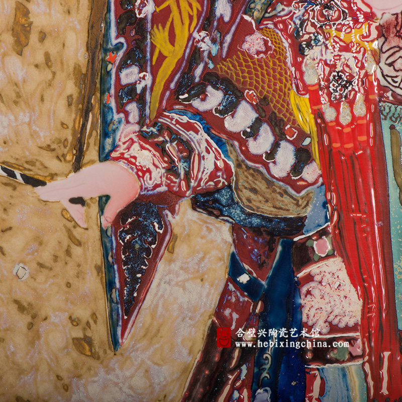 颜色釉在高温烧制过程中所产生的丰富肌理效果搭配上变化的线条和笔法将京剧行头上各种讲究的细节和不同材质的多样质感呈现的精彩而富于层次。