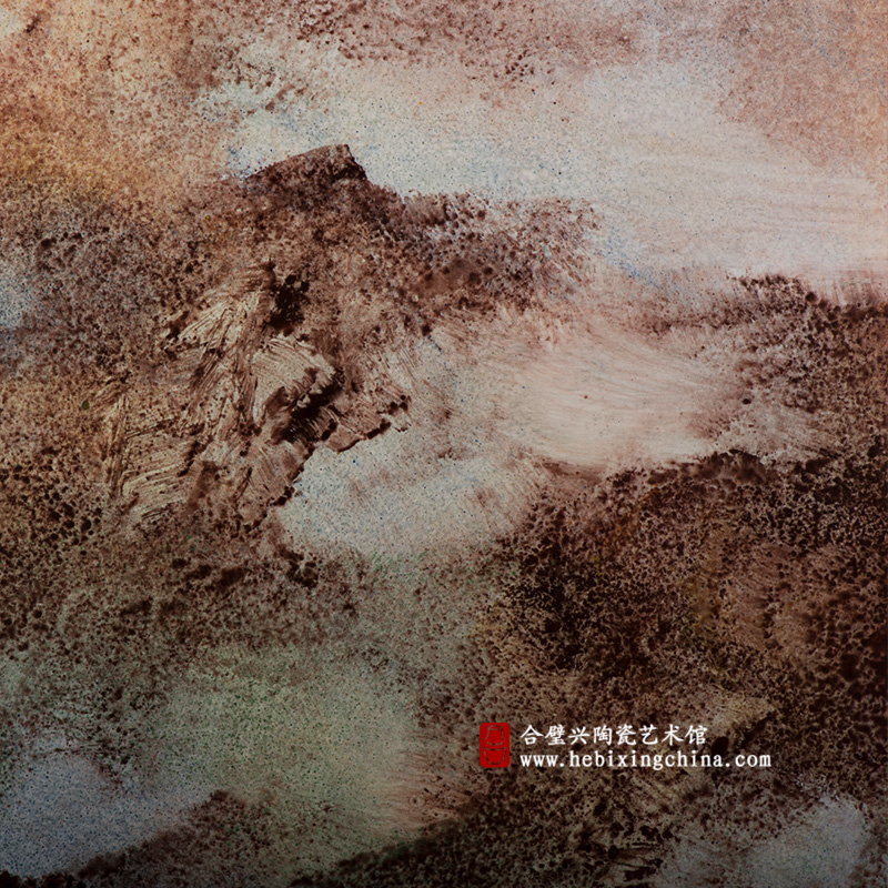 这是一件非常有特点的瓷板画作品,特殊肌理的效果乍看起来像是一幅印象派的油画作品,模糊了具象的主题,只用色彩塑造出光影的变幻和浪漫的意境,细细品味,其中似乎还隐隐有些中国写意山水画的韵味,皴擦点染意趣非凡。