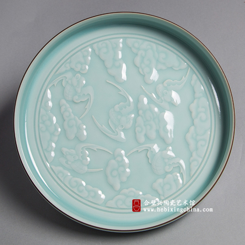 晴空般的纯净釉色让人眼前一亮,一圈醇厚的紫色更是把粉青釉色衬托明朗可人。洗内阳刻出祥云蝙蝠图案,刀法精到,造型生动。洗内五只蝙蝠在祥云间穿梭嬉戏,姿态只只不同,云朵造型圆润可喜与灵动的蝙蝠相应成趣。