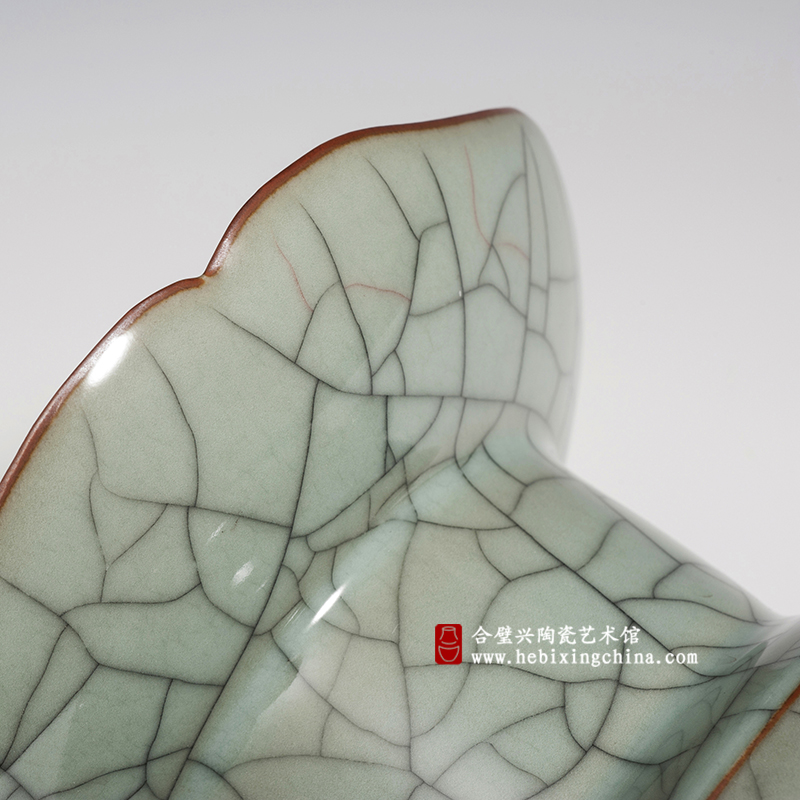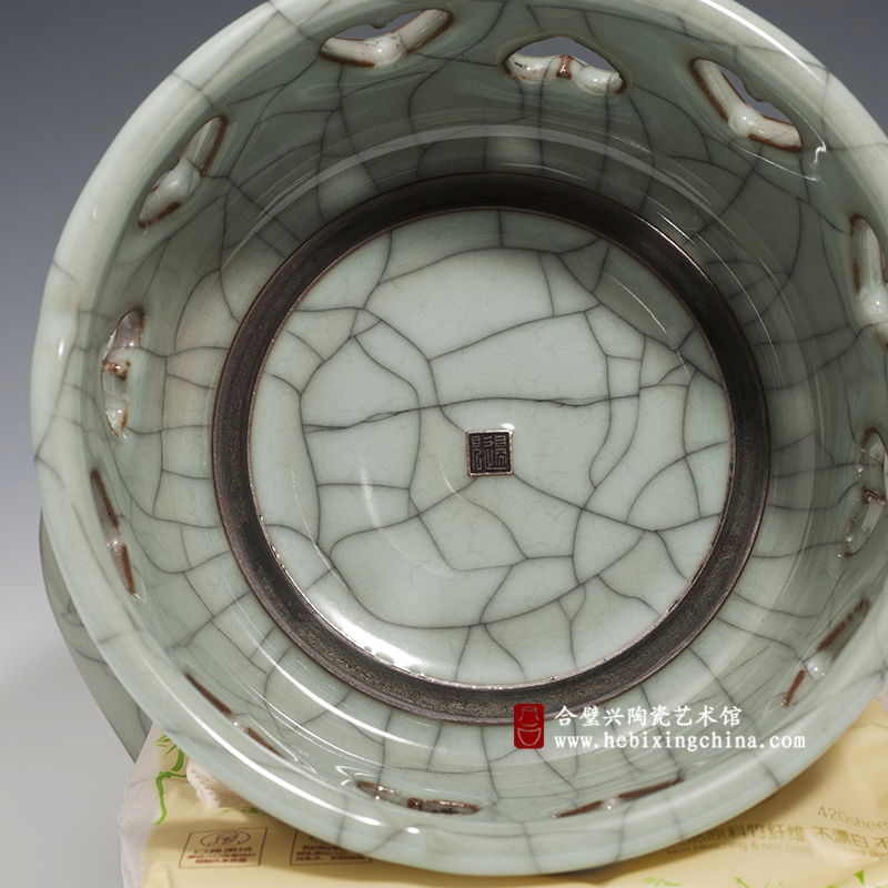 采用内底托烧工艺,不伤台面;釉面莹澈如脂,大开片,饰以金丝铁线,纹理自然细腻。