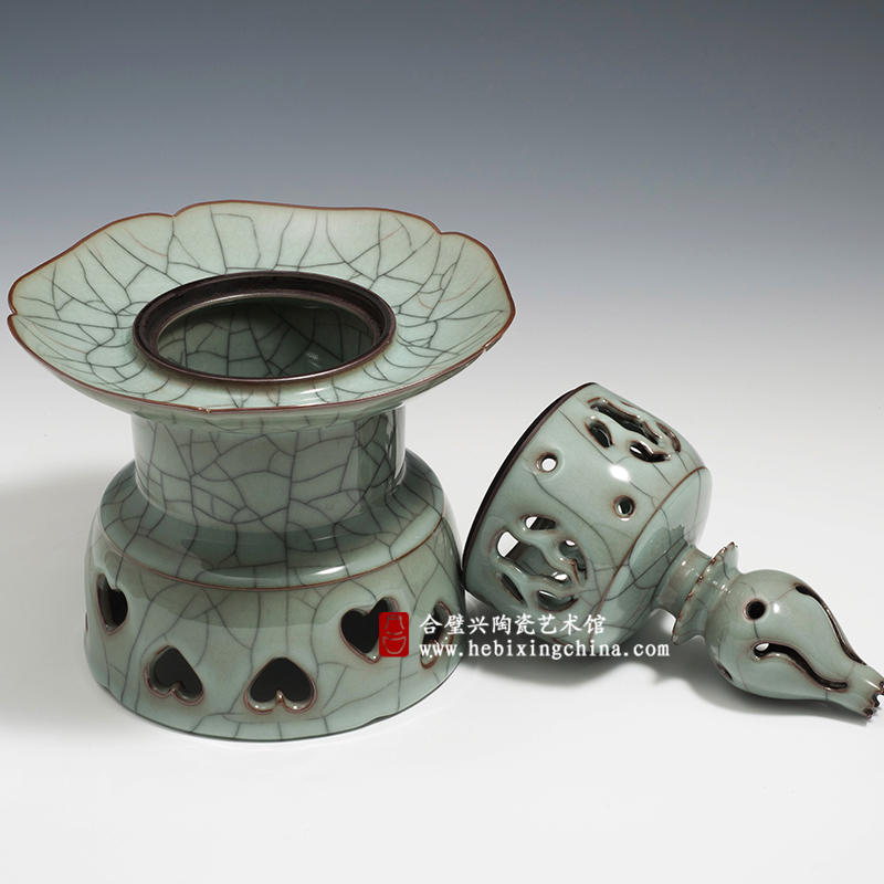 上部为盖,如意纹镂空,盖钮为火焰形,有徐徐上升之势,精致灵动;