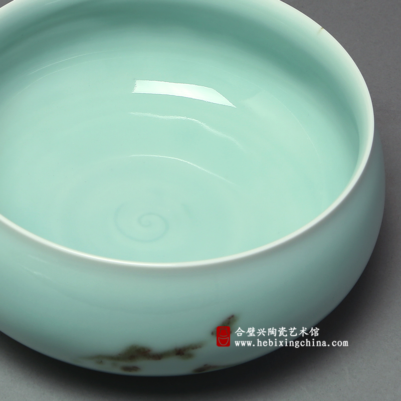 丰润粉青釉所呈现出的清朗静谧的感觉因为一尾点彩小鱼而充满了灵动的生机。洗内中央处手拉坯留下的一段痕迹是作品中的又一神来之笔,它像极了鱼儿游动带起的小小旋涡,既符合了“春波”之名,也点活了鱼翔清池的意境,引领着我们的神思沉浸到这片静谧而充满生机的青色世界中,尽情的享受青瓷带来的快乐。