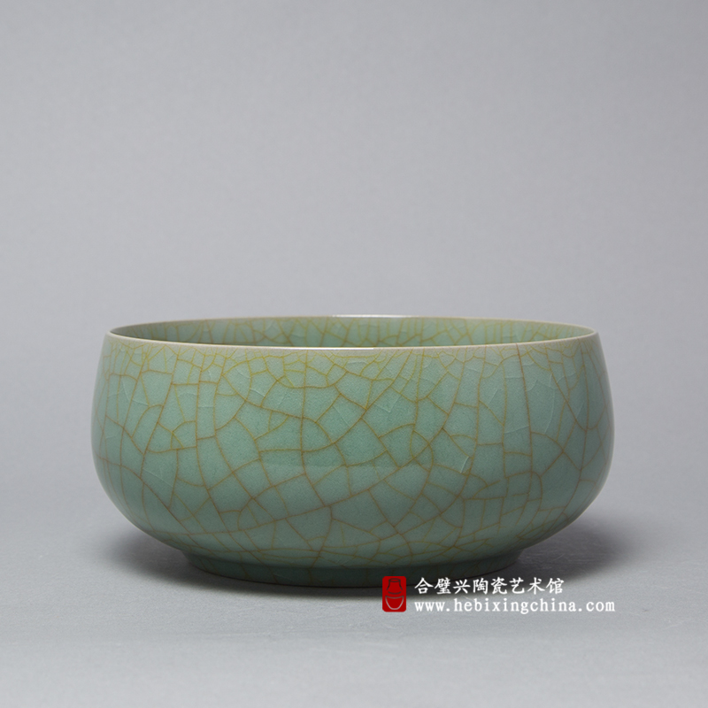 丰厚的釉水从口沿到腹部形成了微妙的色彩渐变,与曲线变化形成的光影让一色的青也生出了许多的层次。开片纹路在变化的青色中纵横蜿蜒,如同被阳光染成金色的树枝向着青色的天空伸展而去,整件作品似乎化成了一株参天的巨树,枝叶繁茂,生机勃勃。