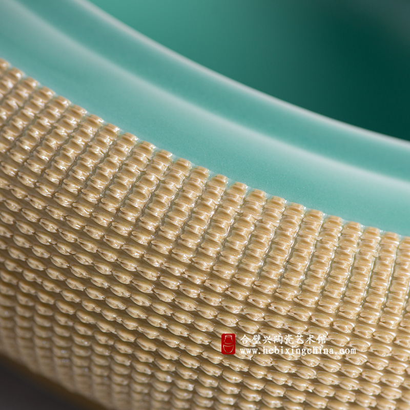 “采菊东篱下,悠然见南山”是多少文人骚客的心中向往,如今毛丹阳老师将这份流传千古的悠远与洒脱注入到了这件青瓷作品中。跳刀与灰釉结合出如同竹篱的独特质感,细腻的梅子青釉化作一汪春水被这竹篱般的独特质感映衬的愈发明媚可人。一枝菊花自篱边探出,映着春水的波光静静的吐露着芳华。