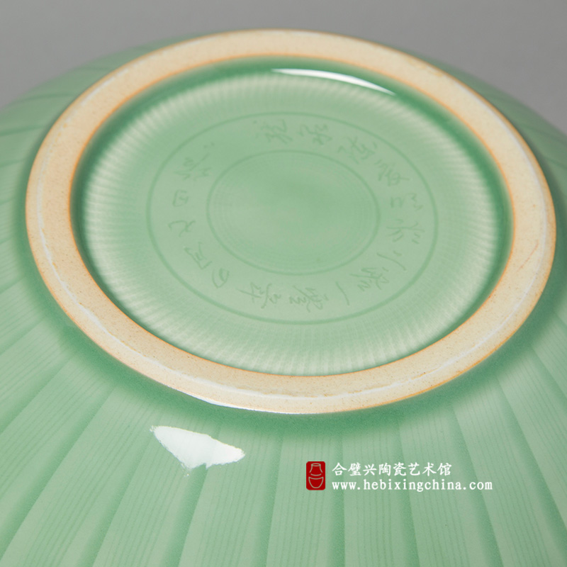 陈爱明老师将弦纹,牡丹纹,莲瓣纹三种经典纹饰有机地融合在同一件作品中,在展现青瓷釉色之美的同时精湛的半刀泥手法将牡丹的富丽洒脱,莲的清丽娇美活灵活现地呈现在我们眼前。