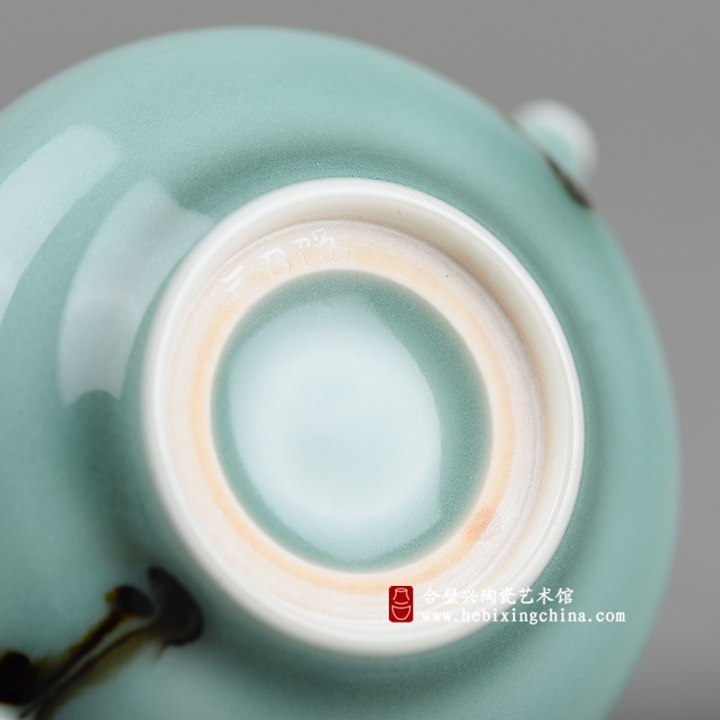 以竹节流,梅枝做把,颇有些紫砂壶的情致,再以饱满如玉珠的壶腹将两者相连,青翠丰腴的梅子青釉为瓷壶染上了翡翠玉雕般的光晕,盖钮做松枝状完整了岁寒三友的主题,精巧可爱的松针,静美灵动的白梅和飘逸潇洒的竹叶让瓷壶显得愈发可爱。几处褐色的点彩在青色的釉面中自然的晕散宛若竹节梅枝上生出的天然纹理,焕然天成的写意韵味让人拍案叫绝。