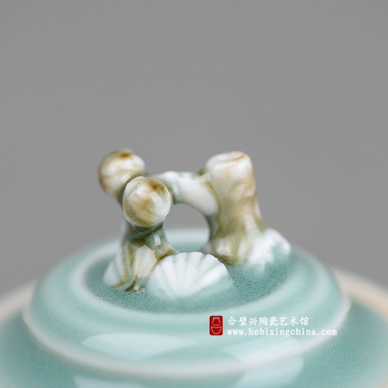 以竹节流,梅枝做把,颇有些紫砂壶的情致,再以饱满如玉珠的壶腹将两者相连,青翠丰腴的梅子青釉为瓷壶染上了翡翠玉雕般的光晕,盖钮做松枝状完整了岁寒三友的主题,精巧可爱的松针,静美灵动的白梅和飘逸潇洒的竹叶让瓷壶显得愈发可爱。