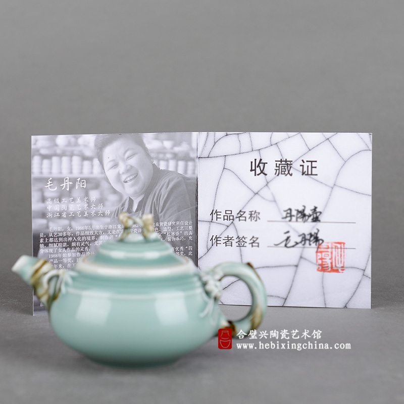 毛丹阳系青瓷名家毛松林大师长女,其作品极富女性内涵韵味,注重细节,构思奇妙,手工细腻,既有传统文人气又富有现代装饰感,个性鲜明,生活气息十足,带给人们艺术和美的享受。毛丹阳把雕塑技巧充分运用到青瓷装饰上,那些含蓄、细腻、富于变化的线条和那些生动鲜活、舒展饱满、刚柔兼备的装饰图案,让这个沉静清雅的青瓷世界多了许多动感。作品多次参加全国工艺美术精品展览并获奖,深受喜爱,被国内外馆藏机构和陶瓷爱好者广为收藏。