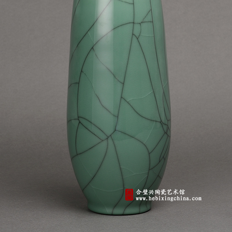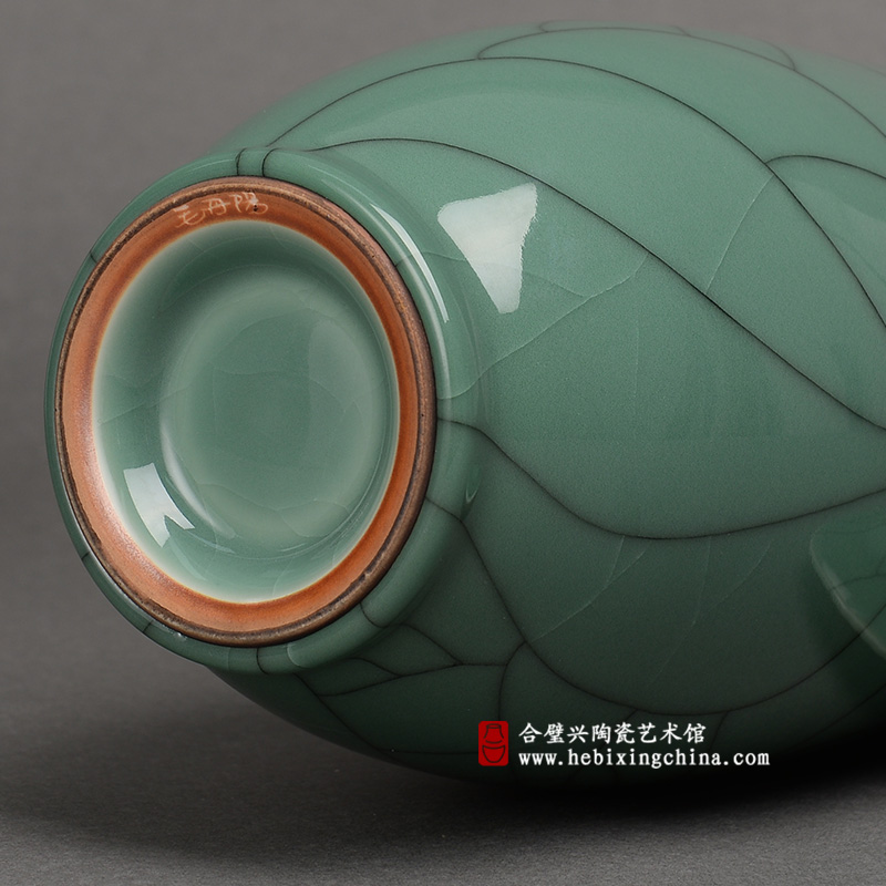 纯净浓郁的梅子青釉色,挺拔的造型让作品化作了一张才出水面还未展开的浓绿荷叶,卷起的荷叶中仿佛藏着佛国的奇妙世界。