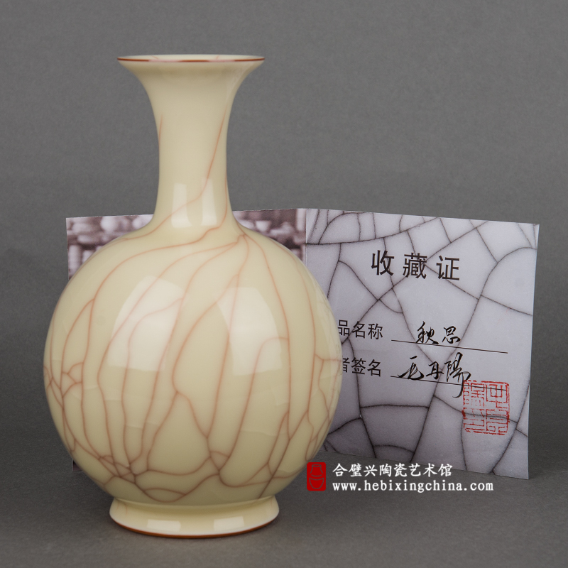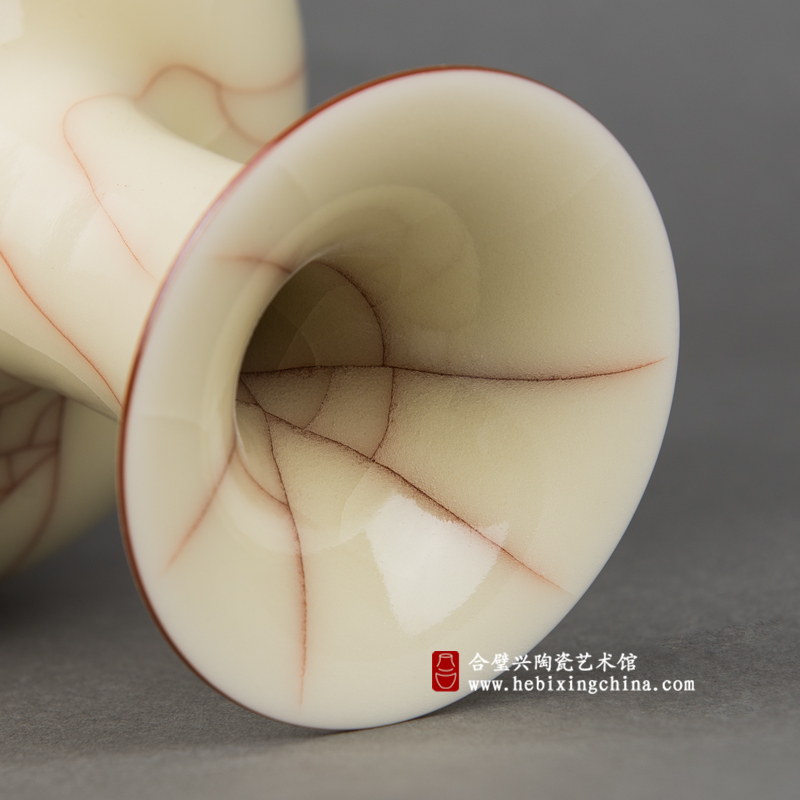 直颈,丰肩,鼓腹的造型颇有天球瓶的神韵,精巧如花朵的撇口却又显出了几分难得的俏皮。雅致的米黄釉,别致的开片纹路,只消一眼便让人心生欢喜。