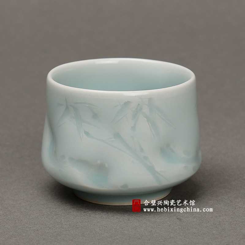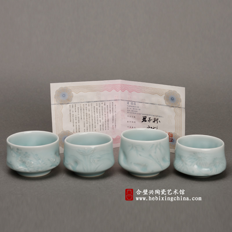 卢伟孙老师将梅兰竹菊四君子的形象刻入四只清雅俊逸的粉青瓷杯中,四只风韵天成的瓷杯便化作了茶席上让人流连的人间盛景。
