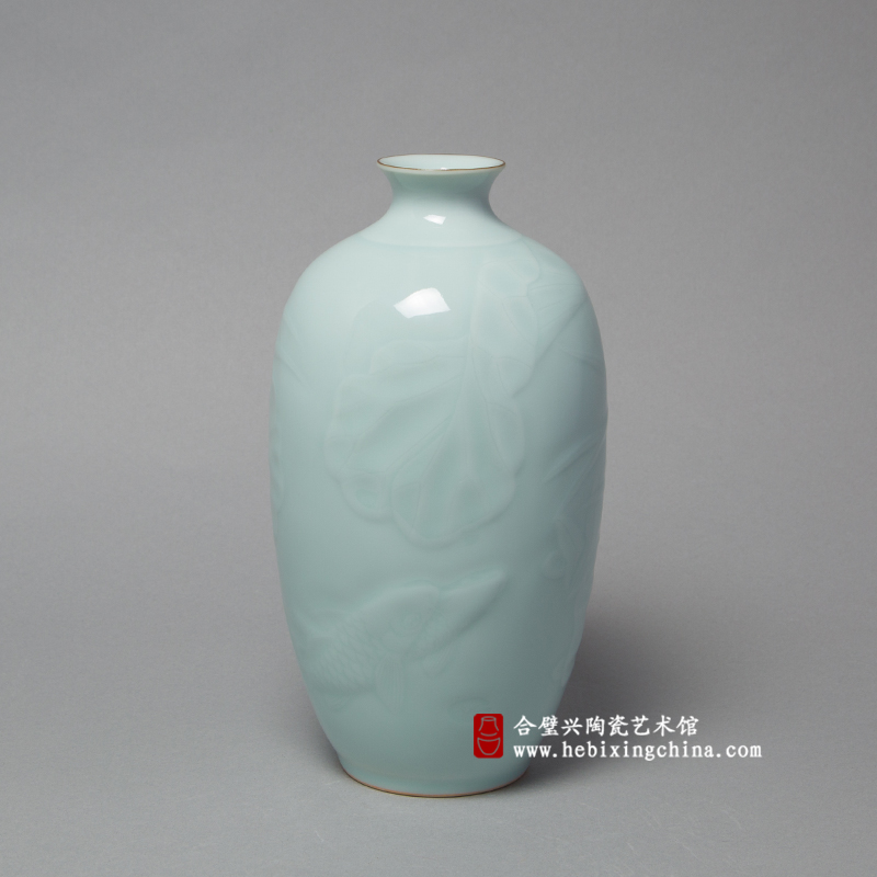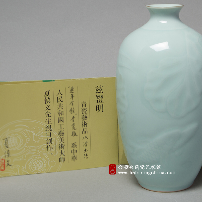 这件《冰清玉洁连年有余》集古典含蓄与清新明快于一身。夏侯文老师以浅浮雕的手法用沉稳流畅的刀法和准确生动的造型将汉代乐府名句“鱼戏莲叶间,莲叶何田田”活化于端丽的瓷瓶之上。
