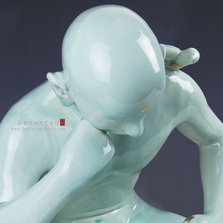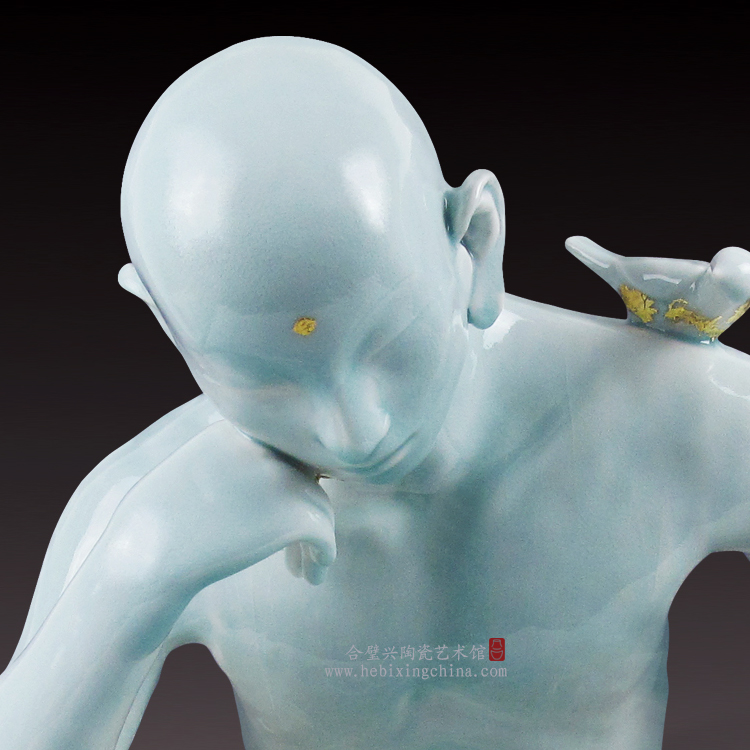 该作品对于传统的佛像雕塑形态更是一个很好的突破,颠覆了传统的造型形式,特别是对于景德镇传统陶瓷雕塑范畴是很好的拓展,采用的影青裂纹釉色以及装饰符号具有很强的现代意识。在景德镇的陶瓷烧造历史上,雕塑类的大型作品是很难成型和烧成的,本作品较大的尺寸以及丰富的造型变化使其成型难度成倍增加,同时采用了圆雕和捏雕的雕塑手段,体现了作者对于陶瓷雕塑语言的娴熟运用。