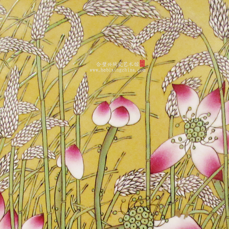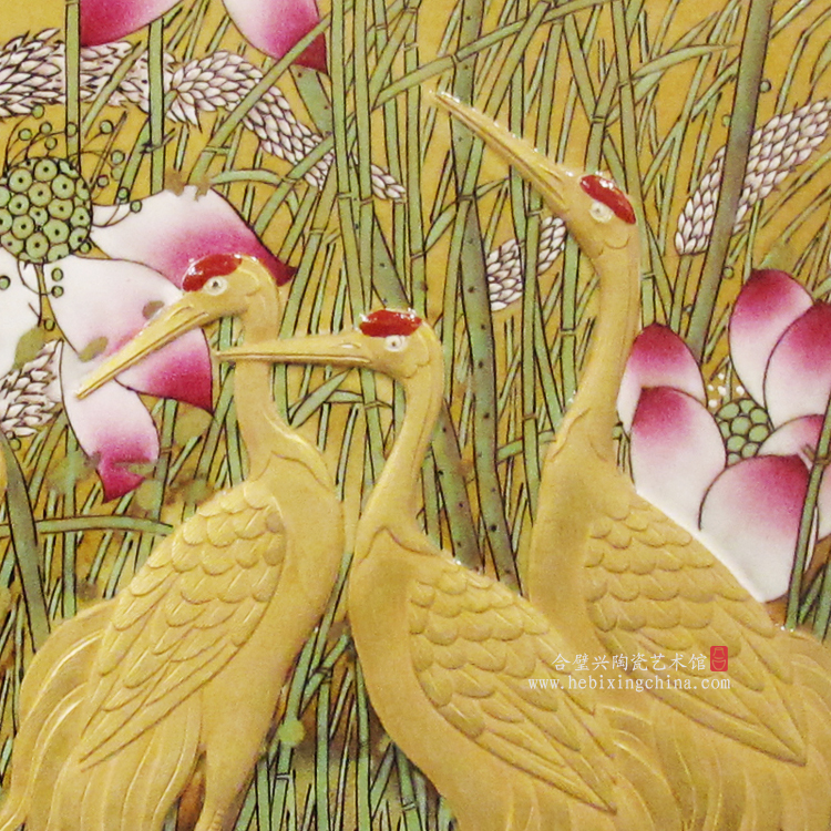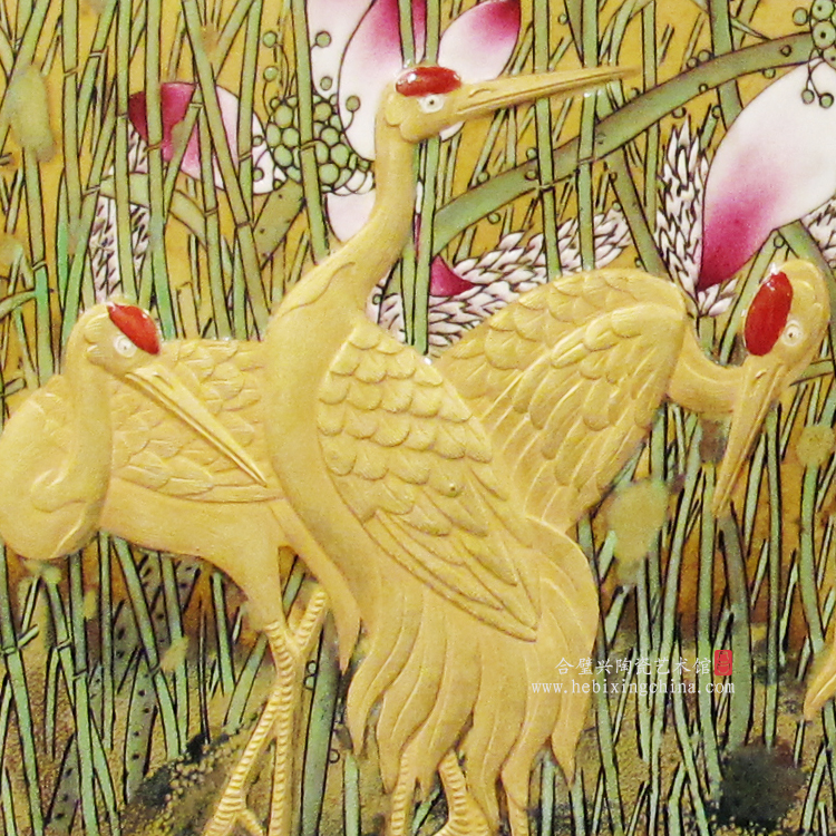 作品以金黄色色釉为主基调来烘托吉祥气氛,用稻穗、荷花、仙鹤的谐音来表现“岁岁和合”的主题,之二作品中的仙鹤的通身用本金着色,采用半刀泥的手法来表现,以稻穗、荷花、仙鹤贯穿画面不仅生动并且有着吉祥的寓意。