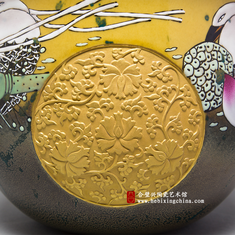 优美的画面不仅让人感叹岁月的静好、金色的年华。作品三面有圆形开窗,窗中阳刻传统缠枝莲纹样,花纹线条流畅,灵动优美。