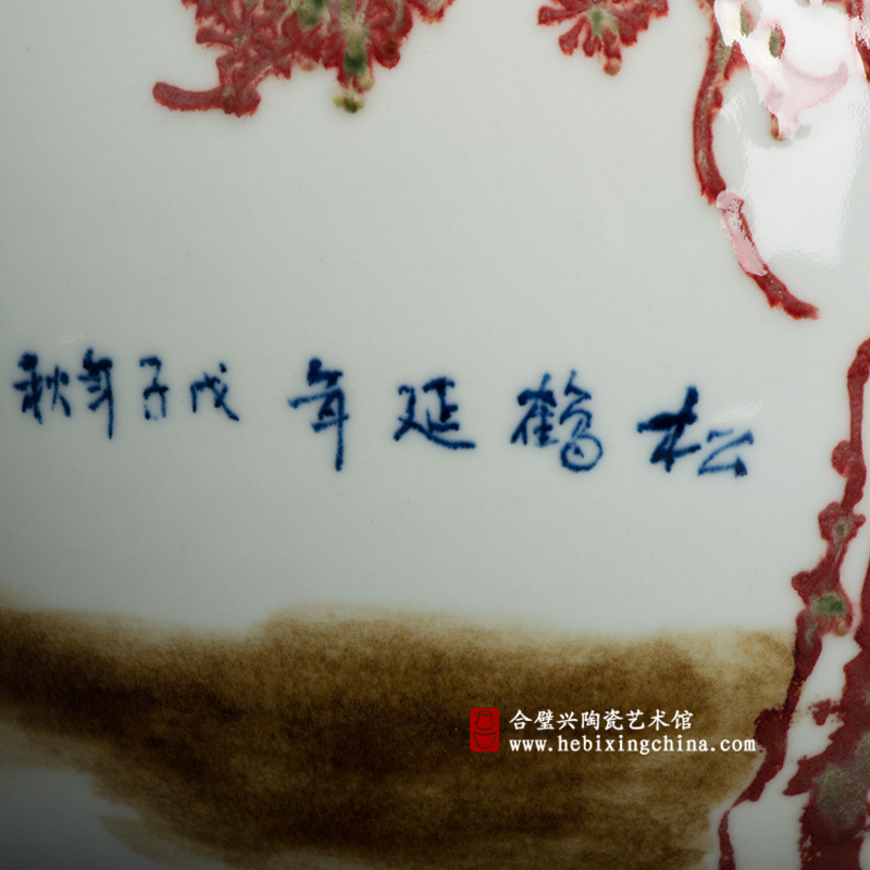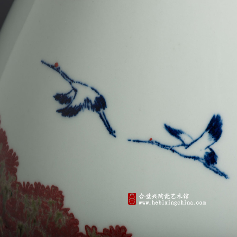 画面构图亦是匠心独运,以青花勾画出天际飞来的仙鹤,大面积的釉里红中的几笔青花,将仙鹤俊逸不群的气质表现的生动而自然,可以说是整个画面的点睛之笔,静态的画面也因这青色的仙鹤而灵动起来。