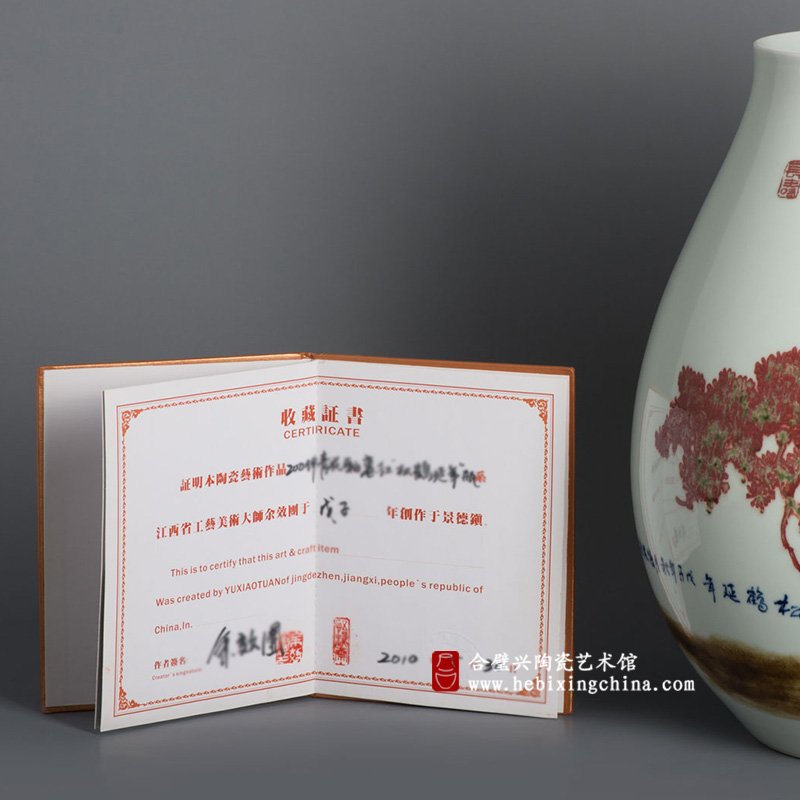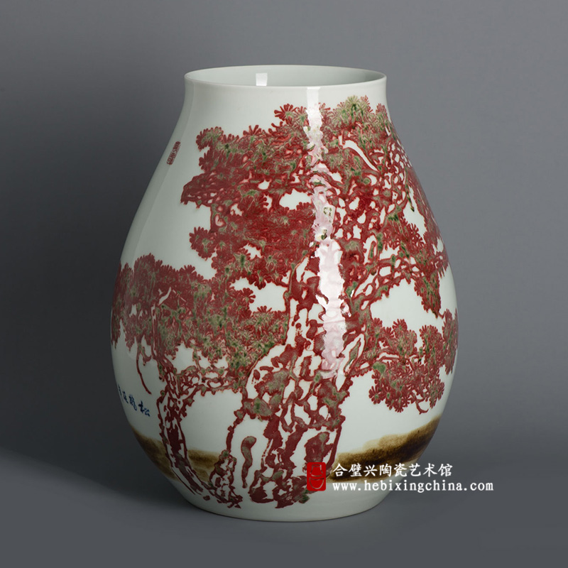 釉里红发色浓郁沉稳,中间闪出的点点翠色可爱的让人移不开眼睛。笔力刚劲,转折有力,勾画点染间将古松遒劲苍翠的精气神描绘的入木三分。