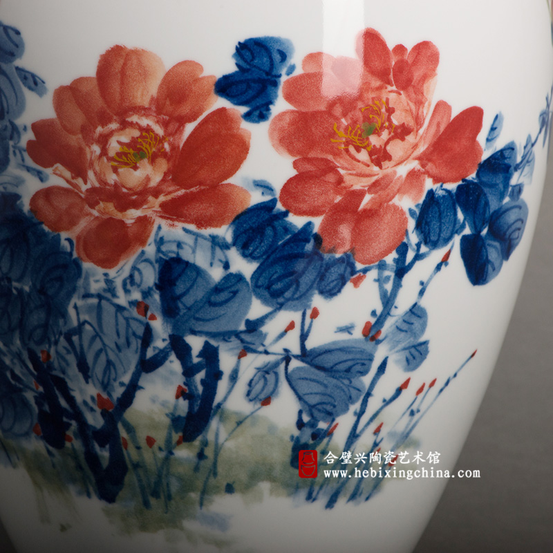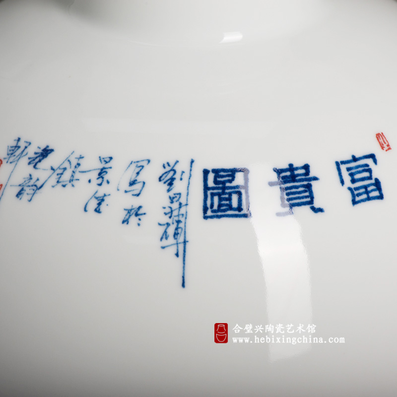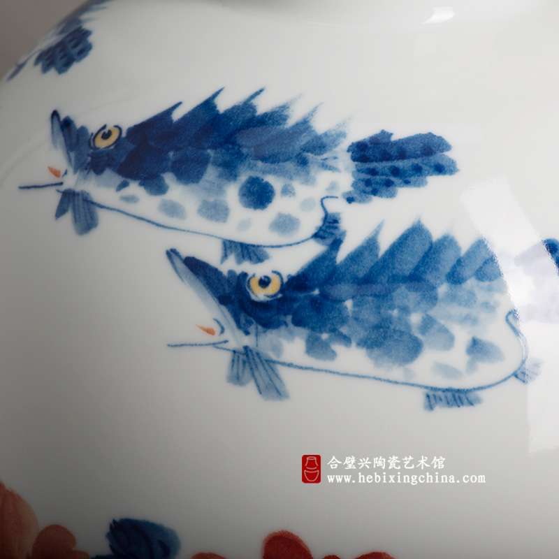 明净的池塘中几尾肥硕的鳜鱼你追我赶游的正欢,池畔绿草茵茵,几株枝叶繁盛的牡丹在醉人的春风中恣意绽放。青草池塘,鳜鱼牡丹,好一幅明媚鲜活的春光图。青花分水自然,用颜色变化表现出枝叶的阴阳向背,十分生动。釉下五彩通透鲜艳,整个画面就像沐浴在春天的阳光里,温暖明亮生气勃发。