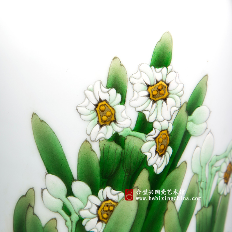 瓷瓶弧形的表面增加了画面的立体感,也增添了移步换景的情趣;莹白的胎体和光润的釉面则凸显出这组山石与水仙组合的清新脱俗。