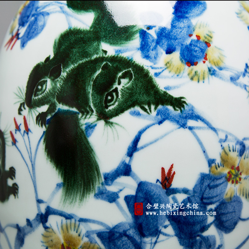 他以青花为藤,彩釉为花,将春光里的花藤描绘的格外动人,开满黄色花朵的藤蔓蜿蜒着铺满了整个画面,花朵红色的蕊珠在清晨的阳光里显得晶莹可爱。