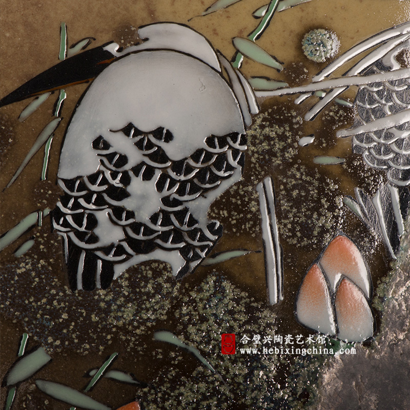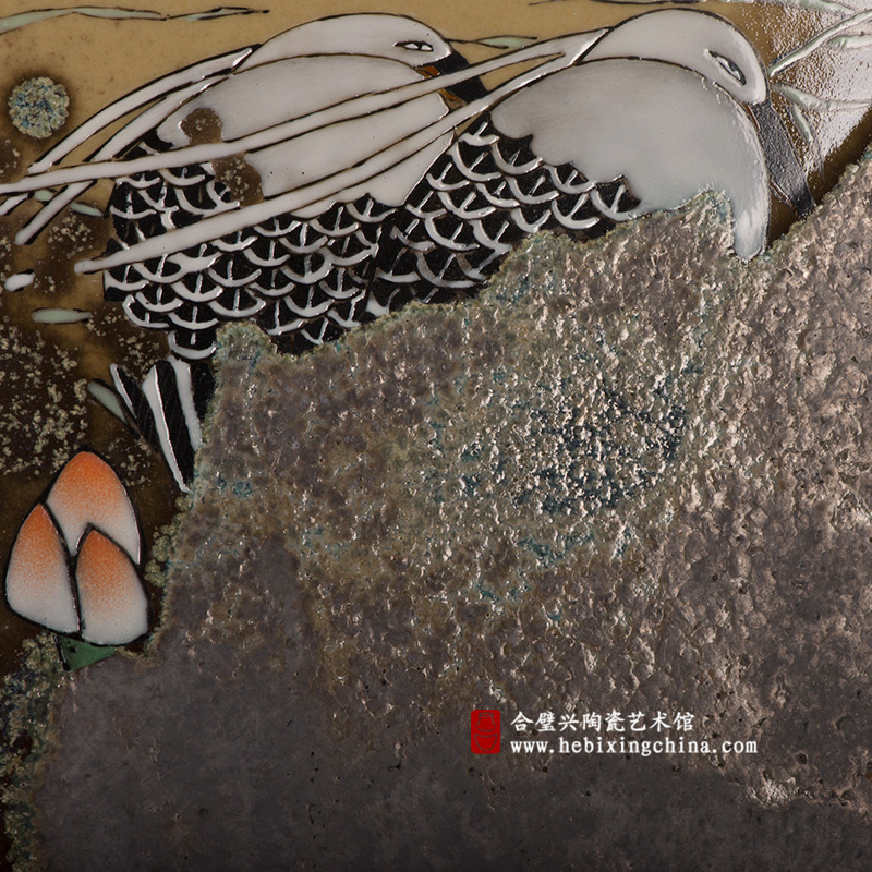 在颜色釉的间隙处粉彩的花苞与白鹭呈现出鲜活又含蓄的美感。宁钢教授以独特的装饰手法将水墨画般的洒脱与瓷板画特有的质感融于一幅作品中,把荷塘描绘成一场安然的夏日美梦 。