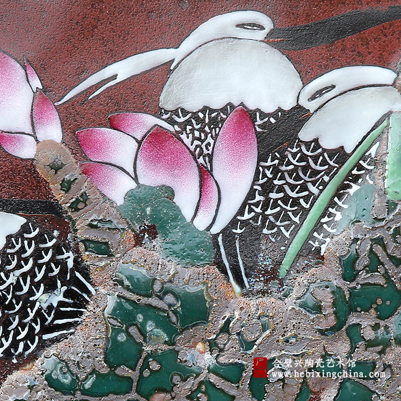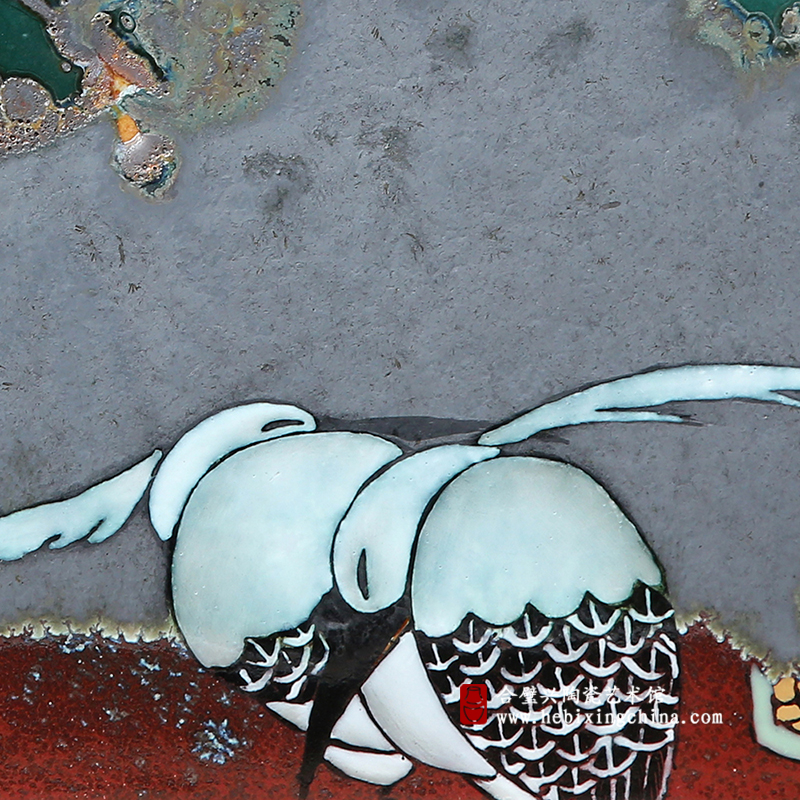 作品在一次烧制窑变的基础上,根据窑变产生色彩和肌理效果进行深度粉彩艺术创作,之后再进行烧制。