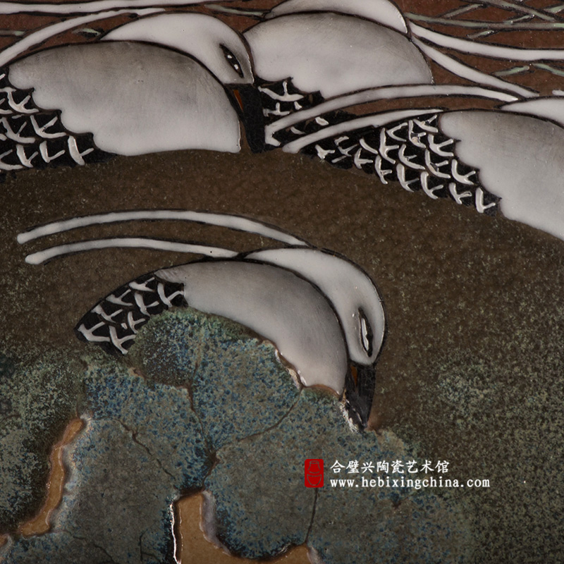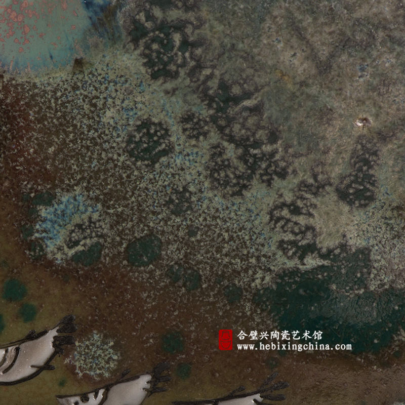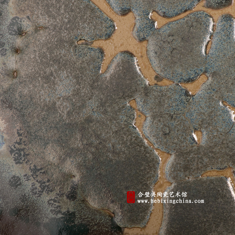 宁钢教授正是利用了颜色釉在高温烧制过程中产生的奇妙色彩和肌理变化,把夏日阳光在荷塘中投射的金色波光表现的异常美好。