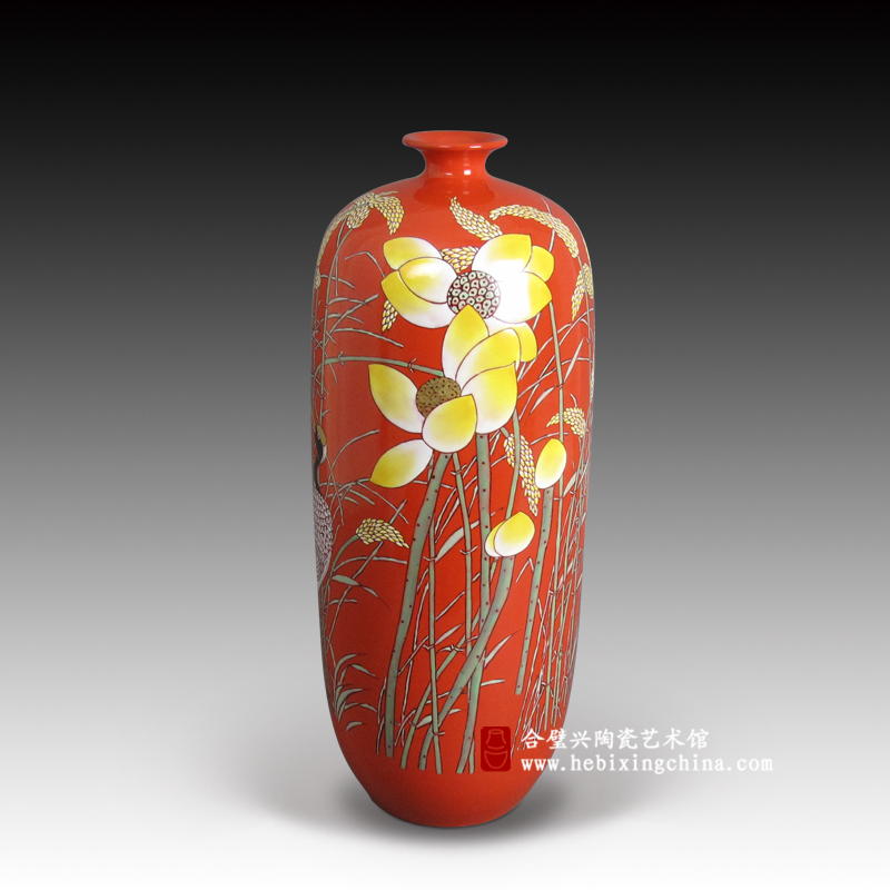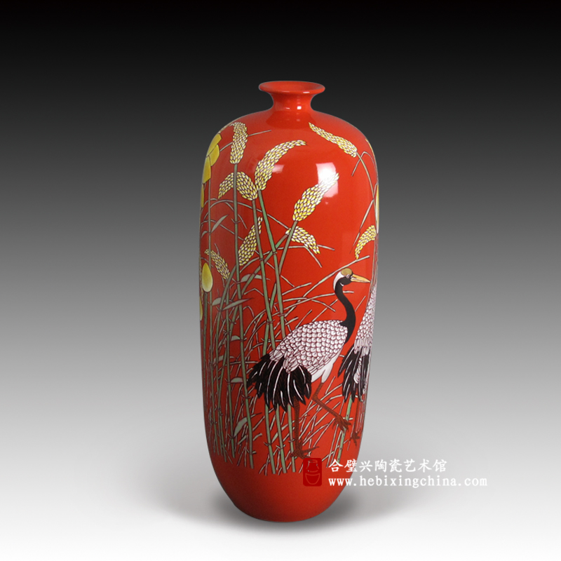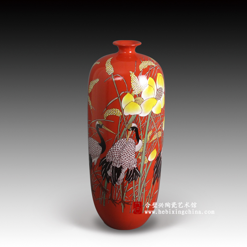 纯正耀目的中国红入眼便让人精神为之一振,连一向温柔细腻的粉彩在这一片红色的背景中也有了奔放热烈的气质。粉嫩娇美的荷花,饱满金黄的稻穗,俊逸生动的仙鹤在喜庆的色彩中将荷塘装点出洋洋的喜气。