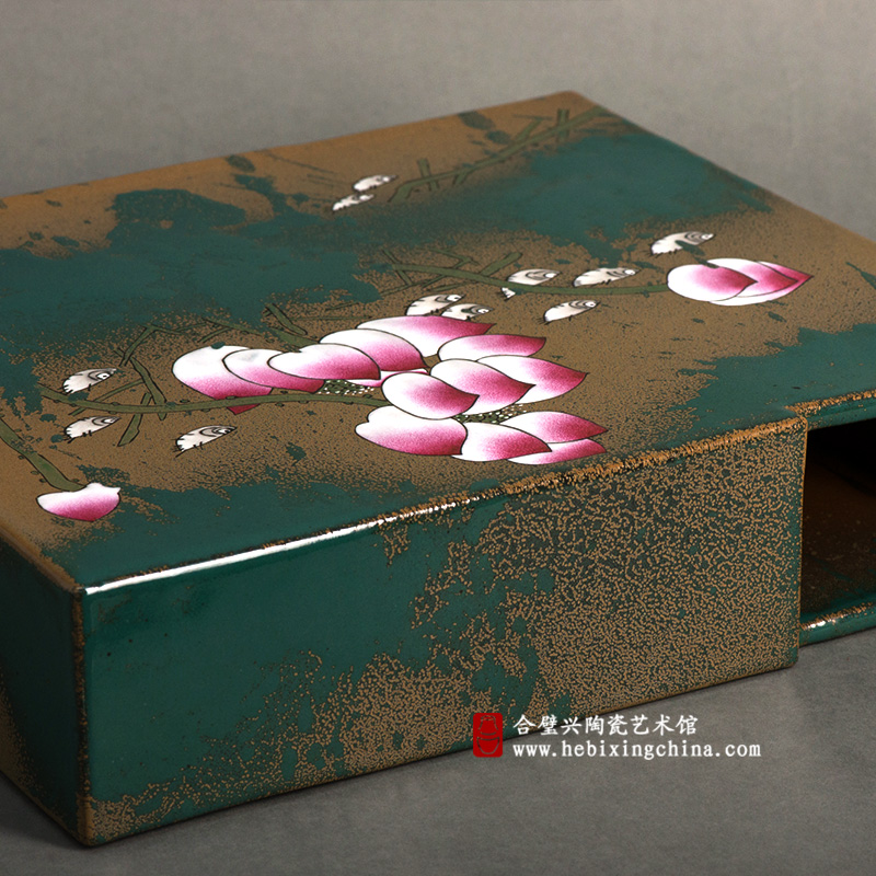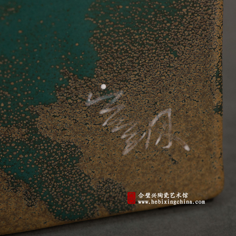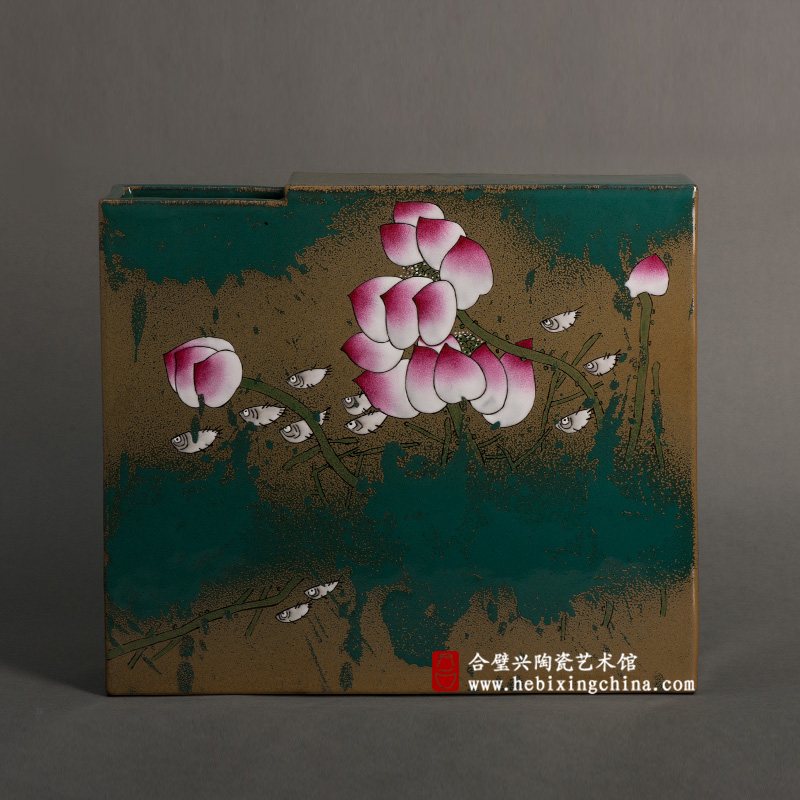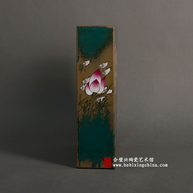 当窑变形成的颗粒质感背景与充满动感的泼彩相遇,醇厚的釉色便产生了微妙的变化。成群游动的小鱼仿佛是荷塘中的白色精灵,把荷塘点缀的生机盎然。