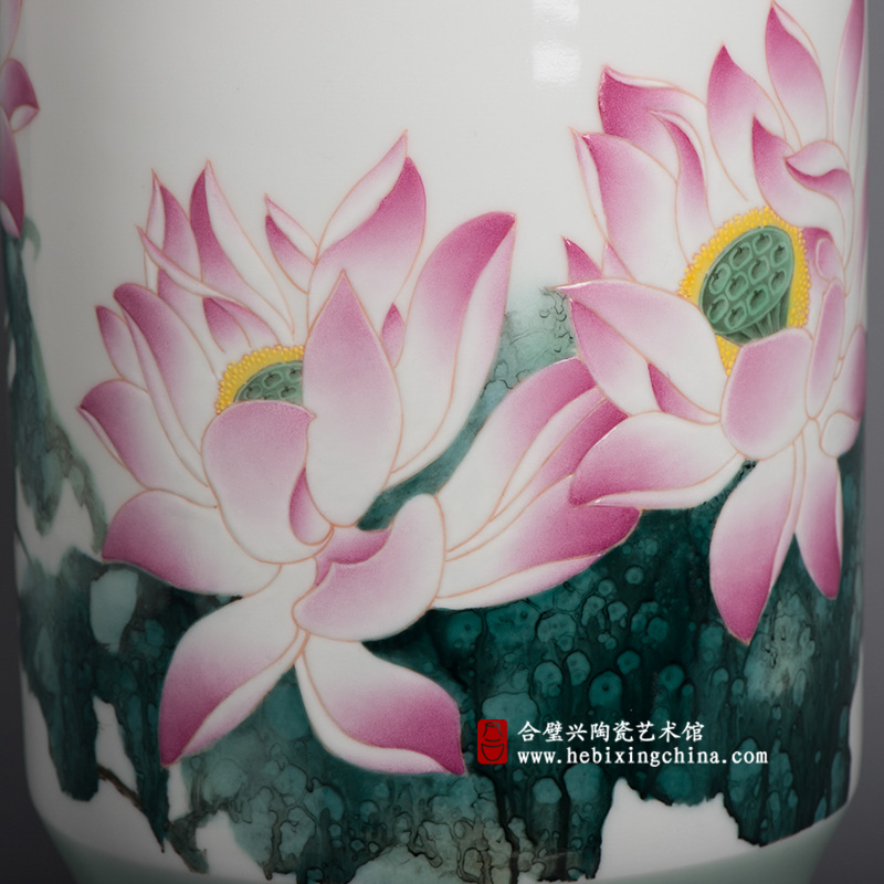 以清新艳丽的色彩在白色瓷胎上描画出五朵盛放的粉荷,浓郁的绿色颜料在粉荷之下泼洒出数片荷叶,泼洒形成的纹理,让浓绿的色彩产生了丰富的变化,将荷叶恣意舒展的姿态生动的呈现在我们眼前。