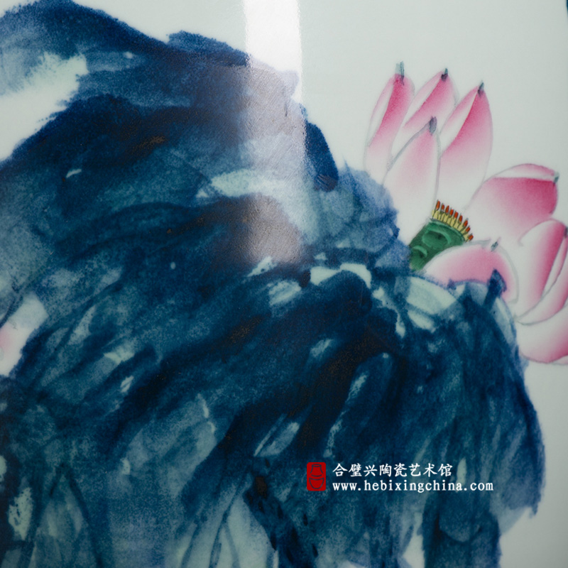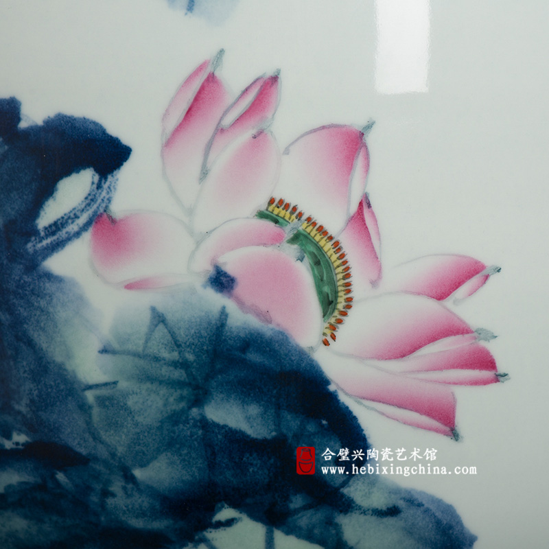 作品构图饱满,设色清新,于俊逸雅致中包含勃勃生机,周鹏老师用青花斗彩的技法,富于变化的笔触绘尽了盛夏时节荷花的万种风情。