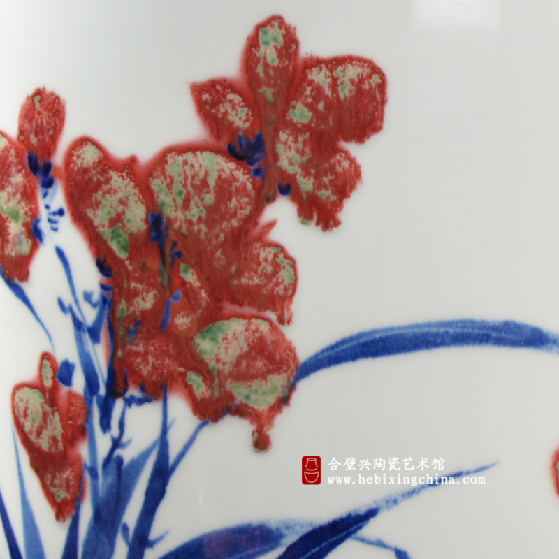 青花釉里红把娇美俊逸的兰花描绘出了不一样的风情——鲜艳热烈而洒脱优雅。以典雅的青花为叶,深水中水浅水的色彩变化把兰花茎叶的姿态描绘的活泼灵动,仿佛随着春风优雅的微微摆动。釉里红中闪出的点点翠色如同红色花瓣上滚动的颗颗晨露,在阳光下闪着莹莹光彩,把花朵映衬的愈加明媚娇美。