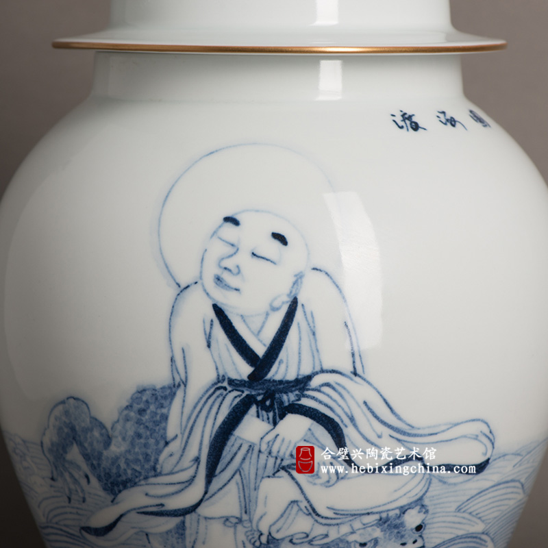 白瓷将军罐上,一位芒鞋坦臂的罗汉偏骑在瑞兽上穿云而行。传统的器型,传统的画面题材却让人眼前一亮。区别于青花画面传统的满构图,作者在画面中大量的留白,既为作品营造出强烈的空间感也让蓝与白的对比变得更加醒目。