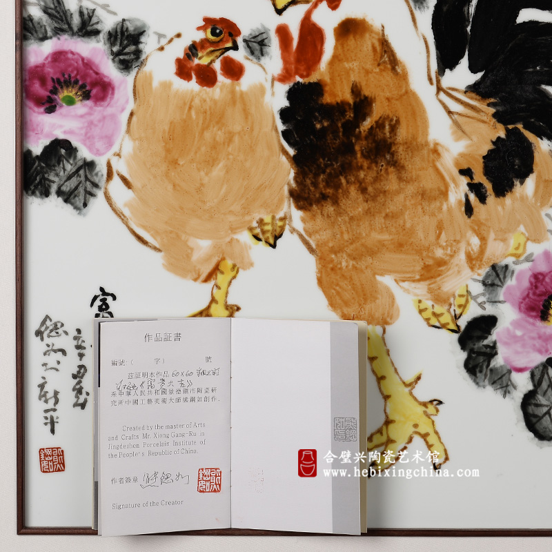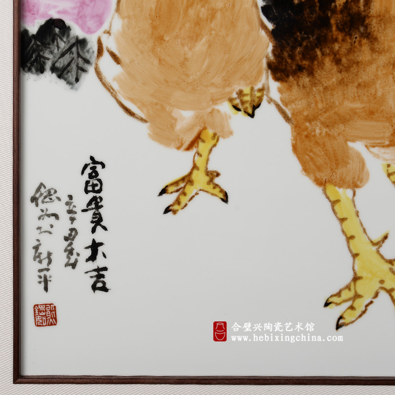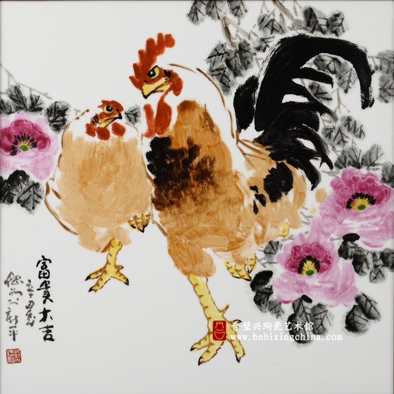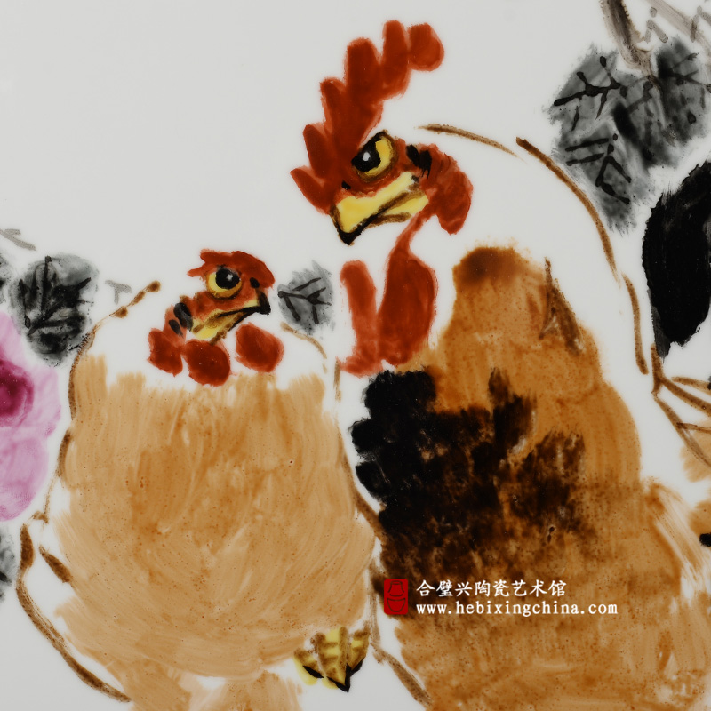 寓意富贵美满的牡丹花与象征吉祥如意的金鸡在作品中相遇,熊钢如老师充分利用了新彩表现力丰富的特点。