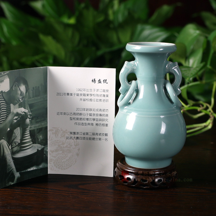 杨盛侃2008年就读于龙泉市中等职业学校陶瓷工艺专业。2013年创办泥承青瓷坊。以古为师,醉心于龙泉窑传统器型和装饰纹样的学习,其作品线条简洁流畅,造型典雅,釉色稳重,既有传统艺术的气韵,又结合了当代艺术的美学理念,时代特征明显,个人风格强烈。