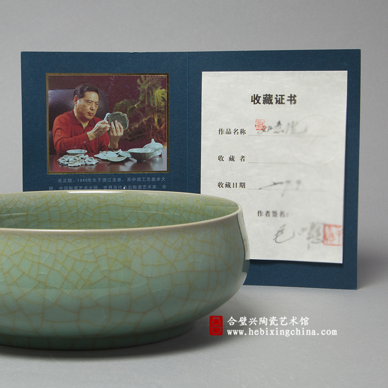毛正聪从事青瓷艺术研究60多年,作品在继承传统工艺基础上大胆创新,造型简洁大方、典雅大气、釉层丰满,温润如玉。哥窑象形开片千奇百态,既象非象,别具一格,创当代青瓷最高境界。作为越系青瓷技艺史海钩沉的大家,毛正聪大师已致力恢复了仿官釉、鱼籽纹等多项失传技艺,为中国陶瓷事业继往开来做出了卓越贡献。