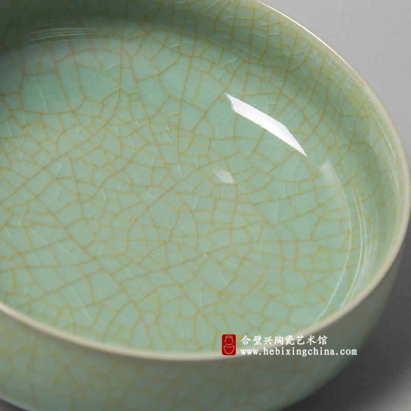 随机性极强的开片在这里仿若被人工驯服了一般在釉面上均匀而舒展的伸延,不着痕迹的融入在清润醇厚的釉色里,自然之美与手作之美交融在一处,到达一种“天然造化尽如人意”的玄妙境界,令观者陶醉其中,不由的用心体味作品中蕴含的美丽与真意。