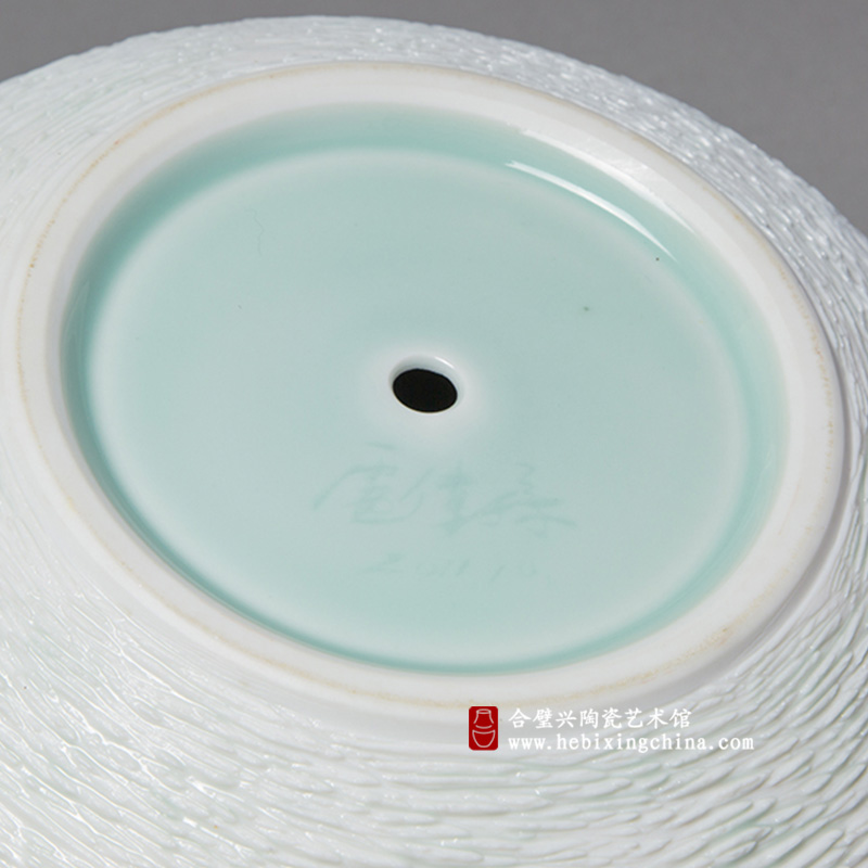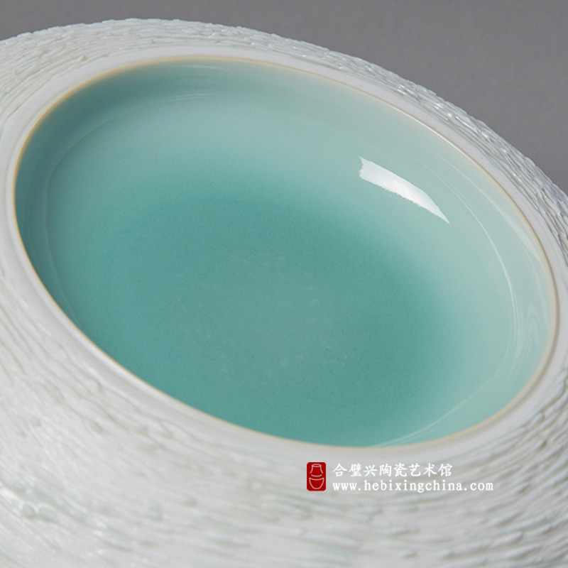 这件作品采用人双层拉坯的手法,弧线优美且圆润,青与白的色彩搭配让人心神舒畅。