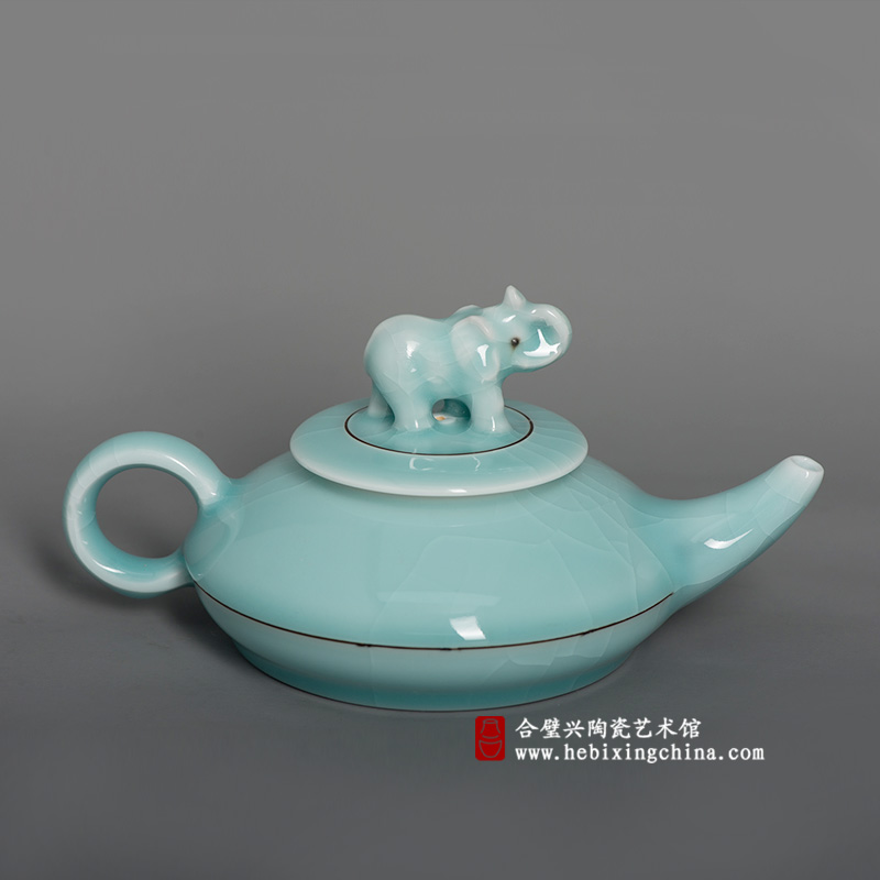 盖顶一头小象憨态可掬,黑色眼睛灵动可爱,长鼻高高扬起,仿佛正站在清澈的溪水中玩耍,茶壶因为这头可爱的小象而显得灵动有趣生气勃勃。