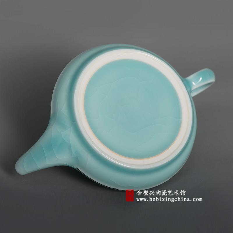 壶身造型简洁,线条圆润饱满,一圈铁线环绕壶身与盖顶的铁线遥相呼应创造出精致有趣的视觉效果。粉青釉色温雅平和,在丰润的釉层中还均匀分布着自然的开片,整把壶如同是天然美玉雕琢而成。
