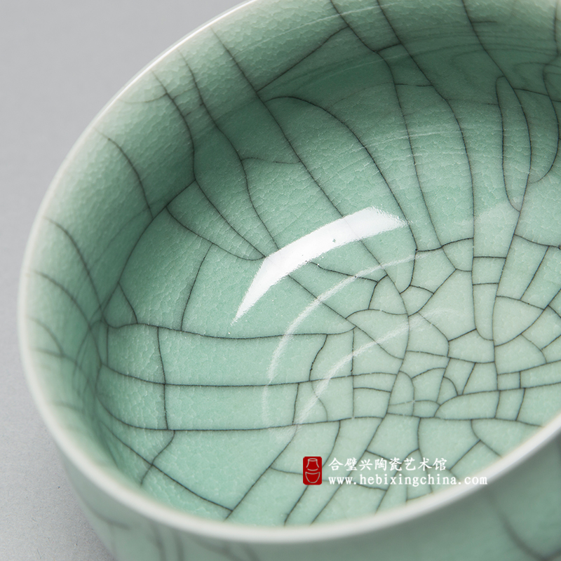 两种不同风格的开片在如玉的梅子青釉层中奇异的和谐共生,连墨色铁线中带着的几分西方式的抽象美感,也和谐的融入到极具东方含蓄审美的清润釉色中。